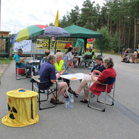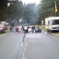 Bikerstammtisch vor der Zufahrt zum Erkundungsbergwerk Gorleben. Am letzten Samstag trafen sich ca.25 unentwegte Mitglieder des Verbandes der Motorradclubs Kuhle Wampe und Freunde, um die Zufahrt zum Erkundungsberkwerk von 11.00 bis 16.00 Uhr zu blockieren.