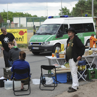15 Teilnehmer aus der Friedensinitiative Kyritz Ruppiner Heide blockierten eine vielzahl der Tore für ca. 4 Stunden am 09.07.2012. Mit einem anschließenden Picknick wurde die erfolgreiche Blockade gefeiert.